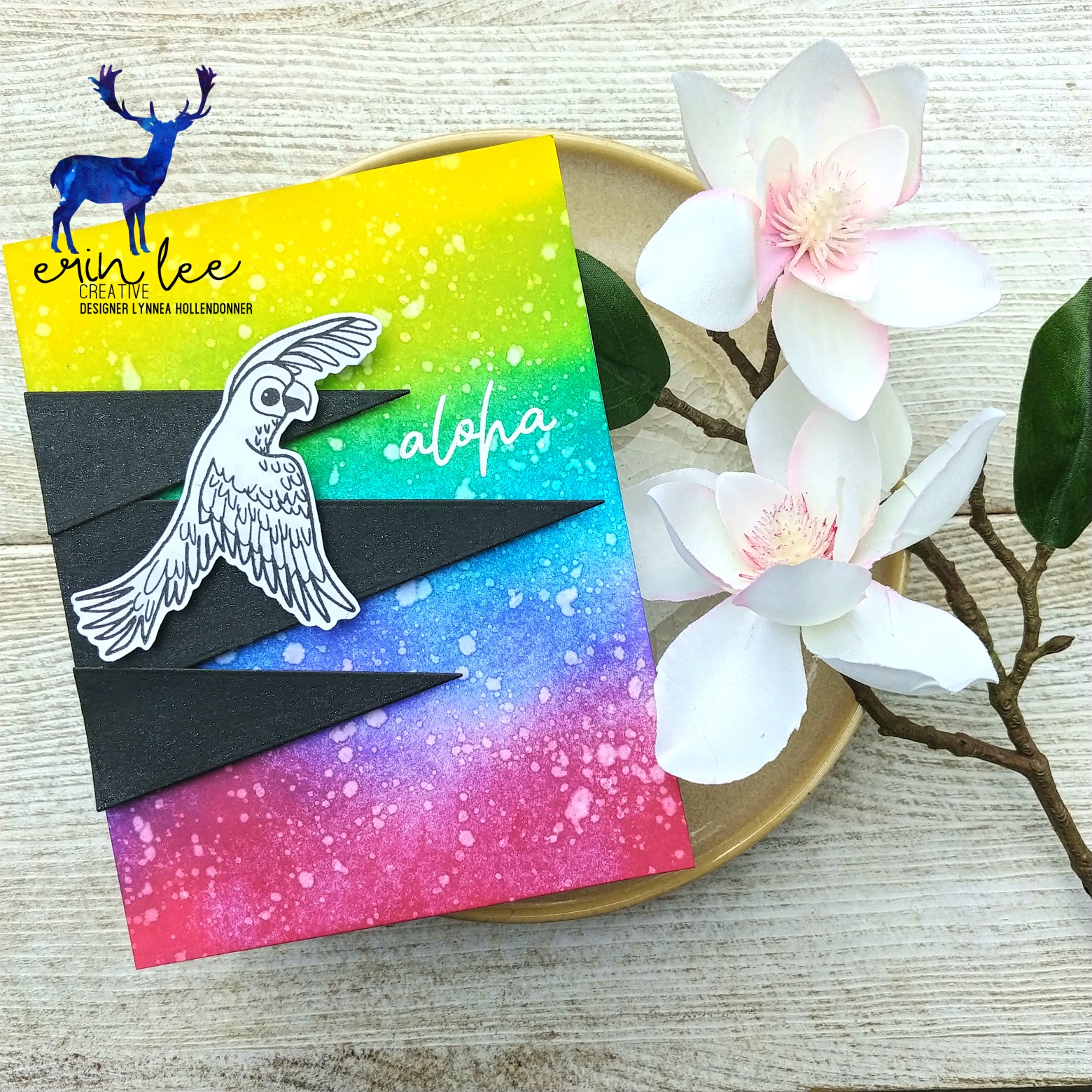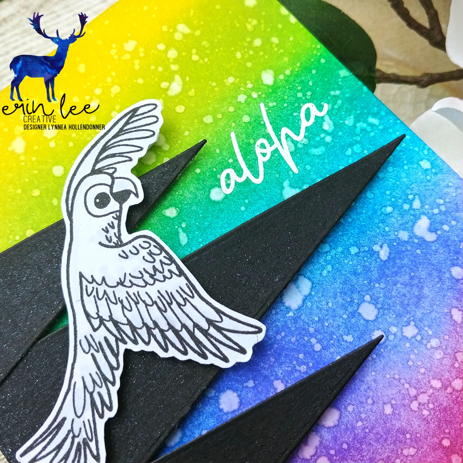 I stamped a parrot from the Tropical Birds stamp set and die cut him with the coordinating Tropical Birds Die Set. You could absolutely give him some beautiful rainbow coloring, but I'm leaving him white for a more dramatic look! I needed a bit more stark contrast, so I die cut a few triangles from the Triangle Nesters Die Set from black cardstock and popped them up on my blended background with foam and added my Tropical Bird die cut on top.