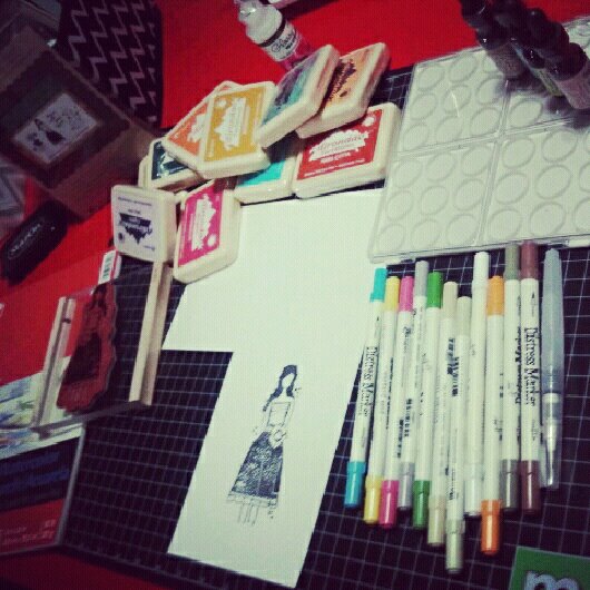 Lots of fun goodies pictured there: Unity stamps (Angie Girl), Adirondack inks, the Ranger palette, Tim Holtz Distress reinkers, Distress Markers and a watercolor brush. OH! And a little bottle of Glossy Accents. Tim would be proud.