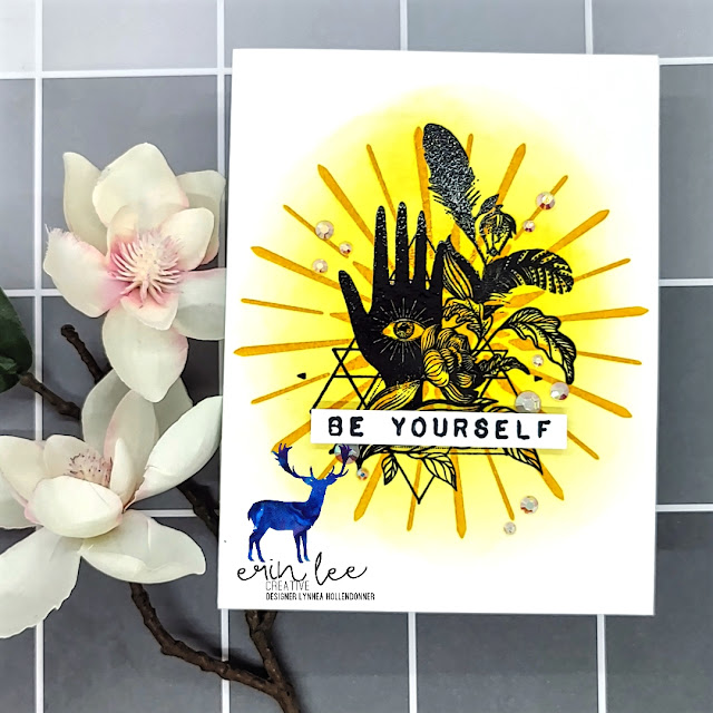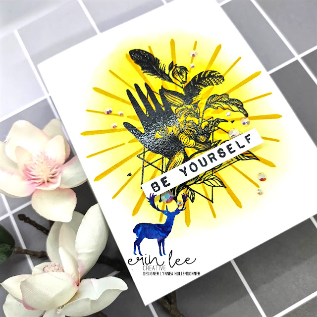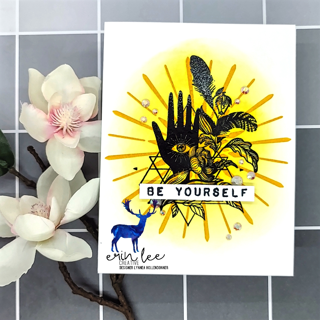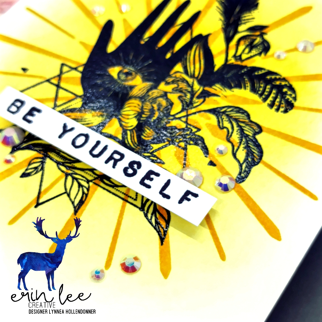 I love to create layers and depth on my cards while still keeping them mail-able. Ink blending and stencils are a great way to do that! I blended a circle of a lemon-y yellow ink onto my card base and then placed the Erin Lee Creative Sunburst Stencil over the top and blended a mustard yellow ink on top of that. The stencil has etch marks in the stencil making it easier than ever to line up the stencil directly in the center of my card. The two layers of yellow ink give a lot of depth with no added bulk!