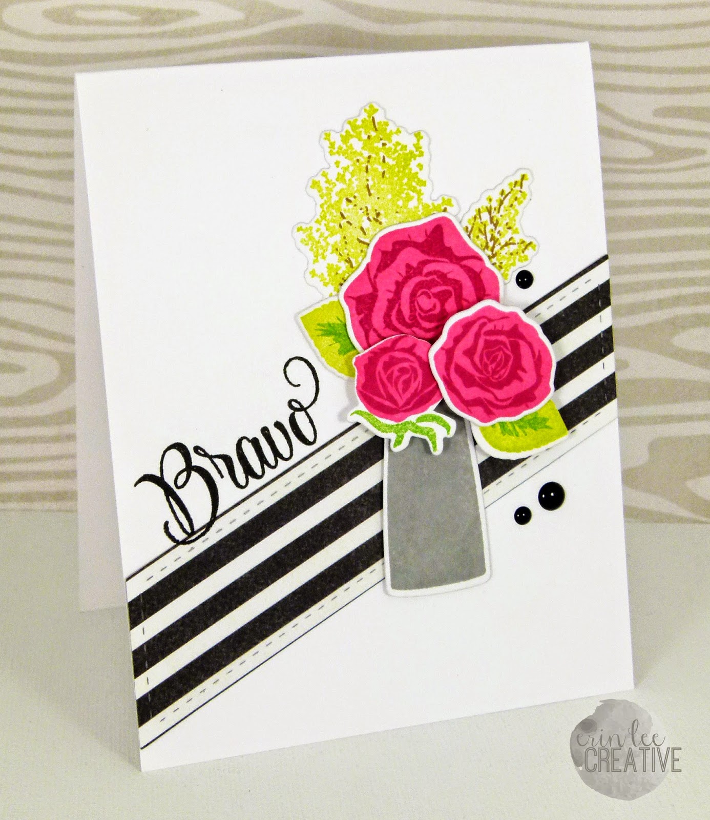 I am posting a card today that sort of fits my news. I made this using a few fabulous products, including Lil' Inker Designs On The Diagonal die, WPlus9 Coming Up Roses stamp and die set and Avery Elle Circle It stamp set.