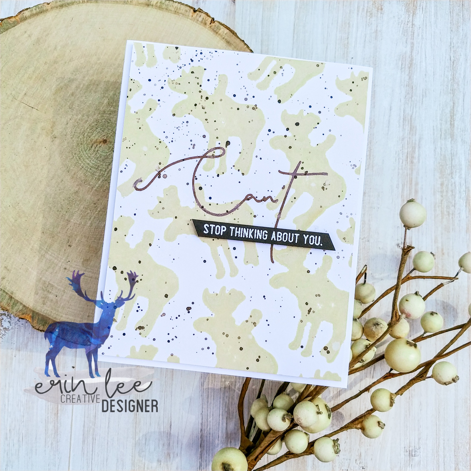 I created by background with the moose die from the Erin Lee Creative Woodland die set. I die cut him from some sticky back fun foam and stuck the foam die cut onto an acrylic block so that I could use it as a stamp. I like to use pigment inks when stamping with foam die cuts because I find the ink transfers more easily, but you could definitely use dye inks if you want! I used Distress Oxide Antique Linen and stamped the moose die cut across my background and then trimmed the panel down a quarter inch so that there would be a nice border around the card.