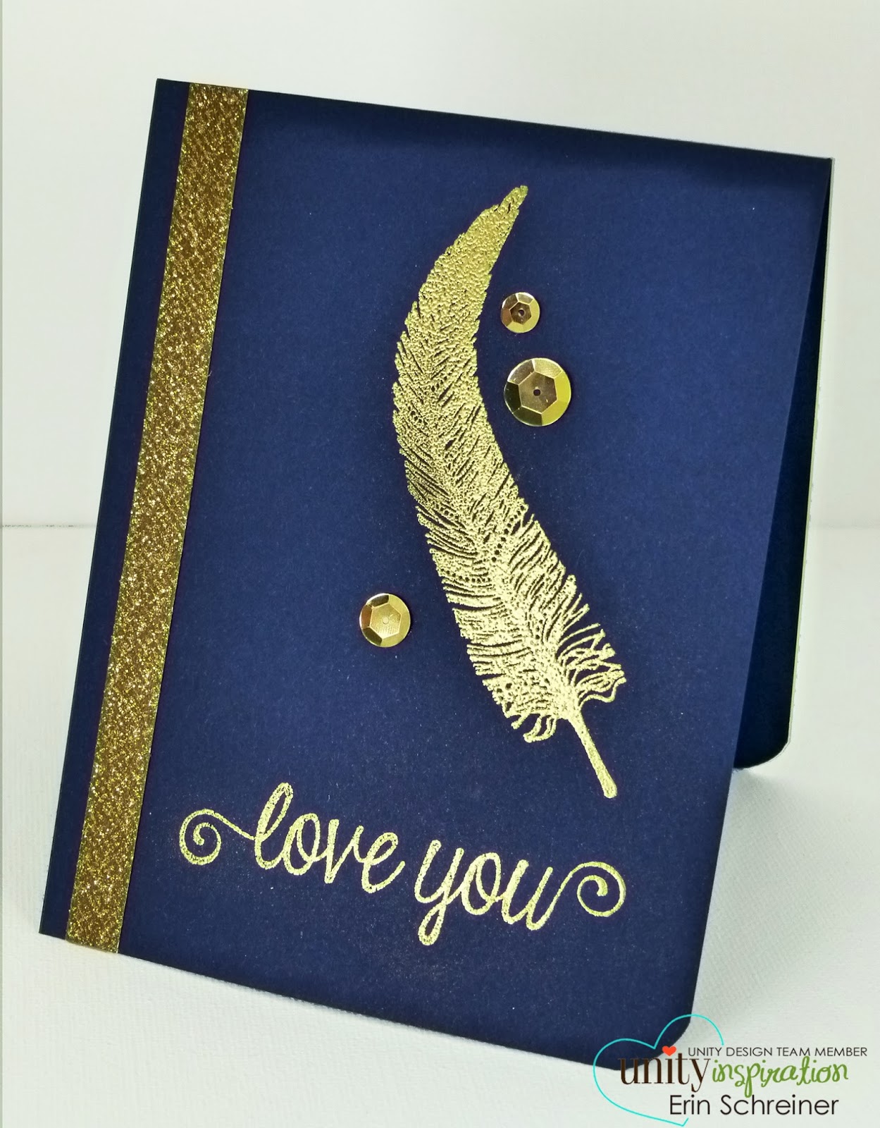 For this simple card, I used Zing embossing powder in gold, Papertrey Ink navy card stock, some gold glitter paper I had laying around, sequins and Unity's Kit of the Month and SMAK kit. Love making cards with the SMAK kit, too!