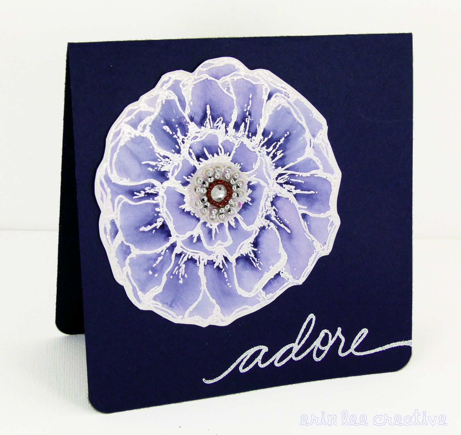The water from the brush pen resists against the white embossing, so it's basically fail proof! Love that. I then cut out the flower and adhered it to my navy card base after I heat embossed the sentiment in white.