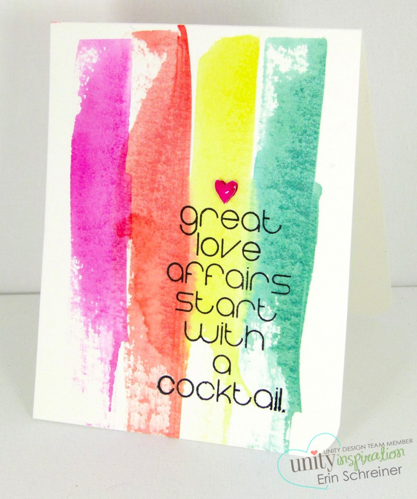 Hey guys! Today I'm posting a fun card I made for Unity Thursday and for Summer Card Camp 2 class. I used my Tim Holtz Distress Stains and one of my favorite Unity sets right now, A Round of Cocktails {which happens to be on SALE today, fyi} with some watercolor paper for a pretty simple technique that makes a bold statement.