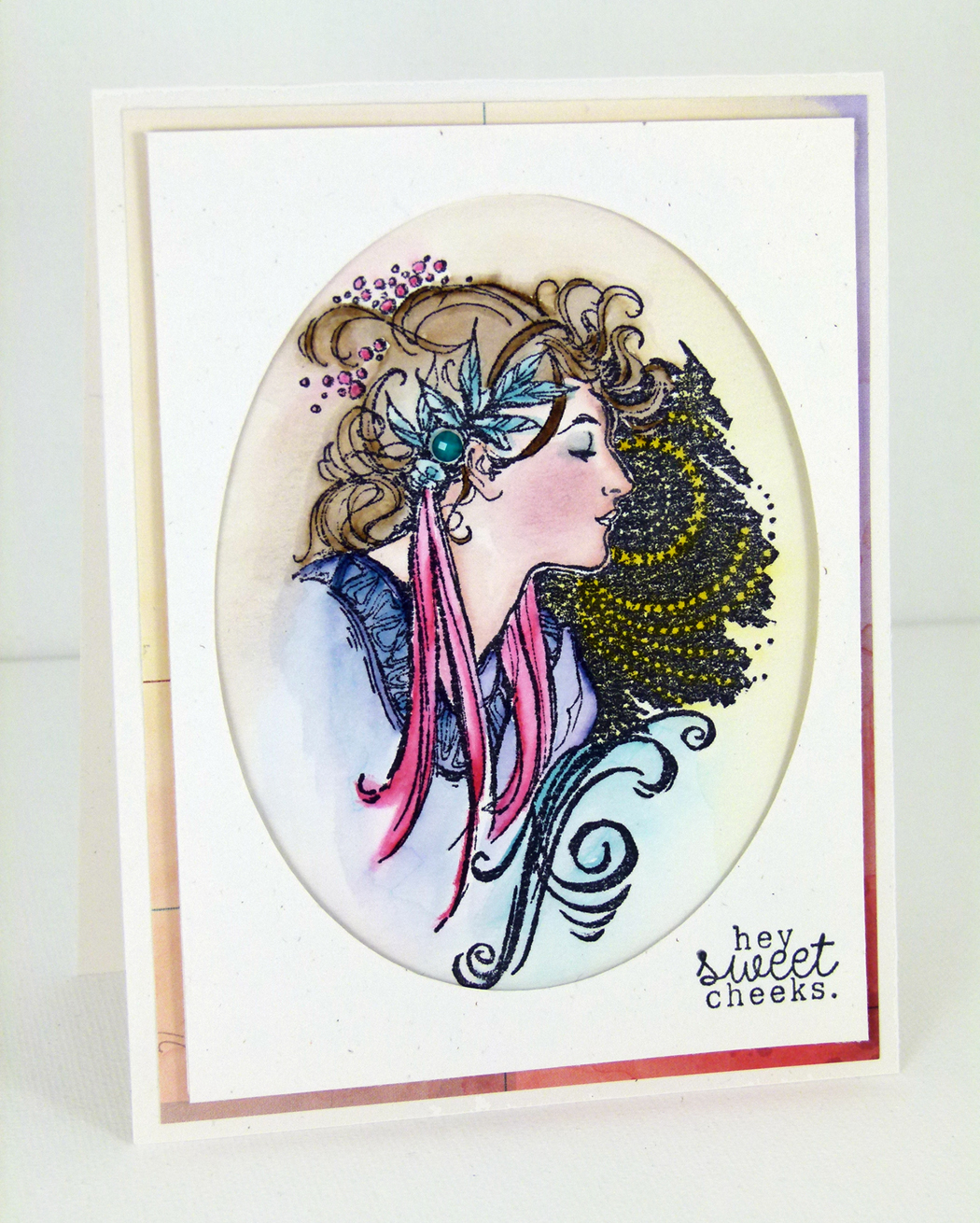 I'm posting a card I submitted to the Just Add Water category. I kind of knew in the back of my mind this one wouldn't get chosen, but it was one of my favorites I created. A good crafty friend sent me this stamp and I couldn't wait to color her up! I used Tim Holtz Distress Markers and a water brush pen {one of my favorite coloring techniques}. The sentiment stamp is from Unity.