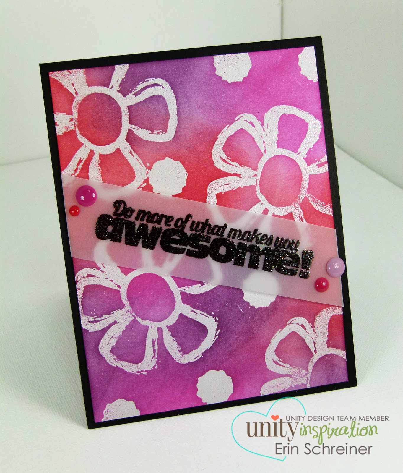 I used the March 2014 SMAK kit to heat emboss white flowers and a splatter from Splatters & Stars on a cardstock panel. I then inked it all up with various Tim Holtz Distress Inks and rubbed off my excess ink from the flowers. Then, I heat embossed the What Makes You Awesome sentiment onto vellum and adhered that to my card. So fun!