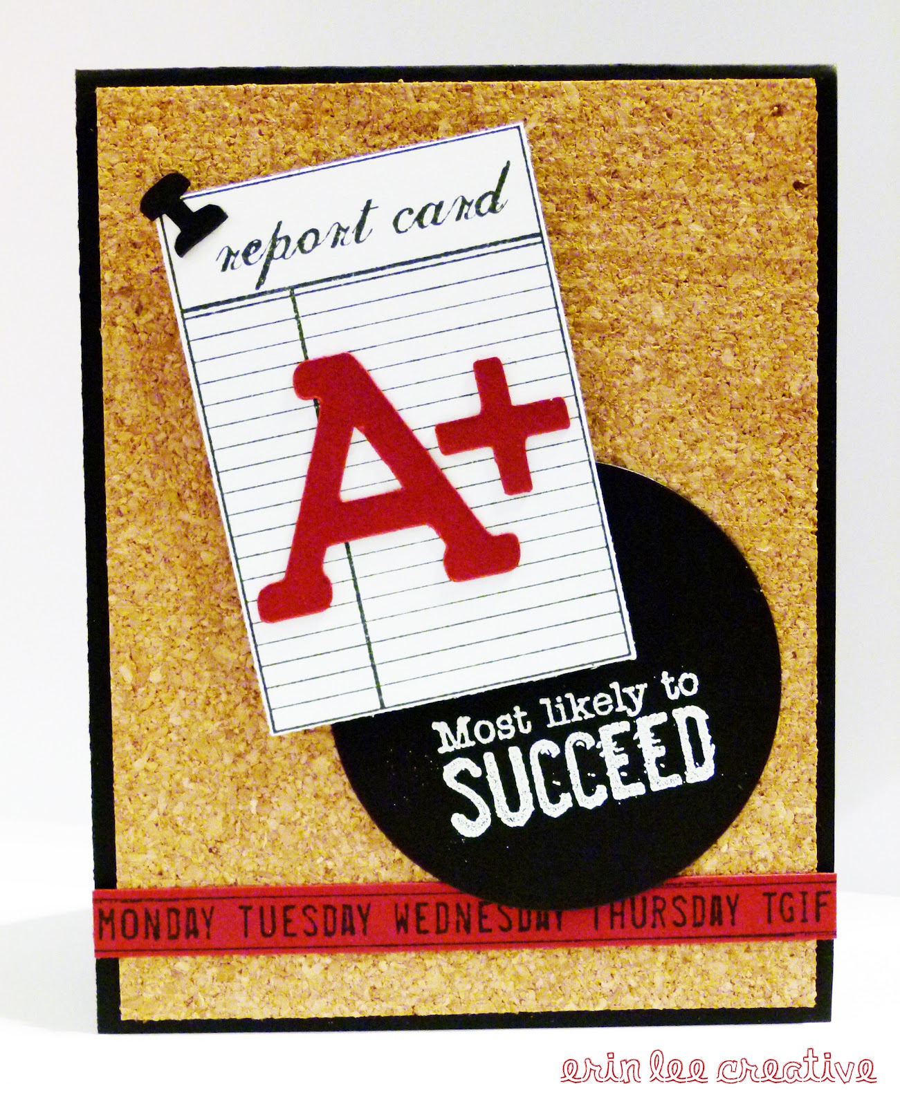 I created this card using sticky back cork I found at Michael's. So fun using different textures on cards. I used Unity Stamp Company's stamp set Smarty Pants. I have used this set so much! I even pulled my Cricut out for this one - I die cut the A+.