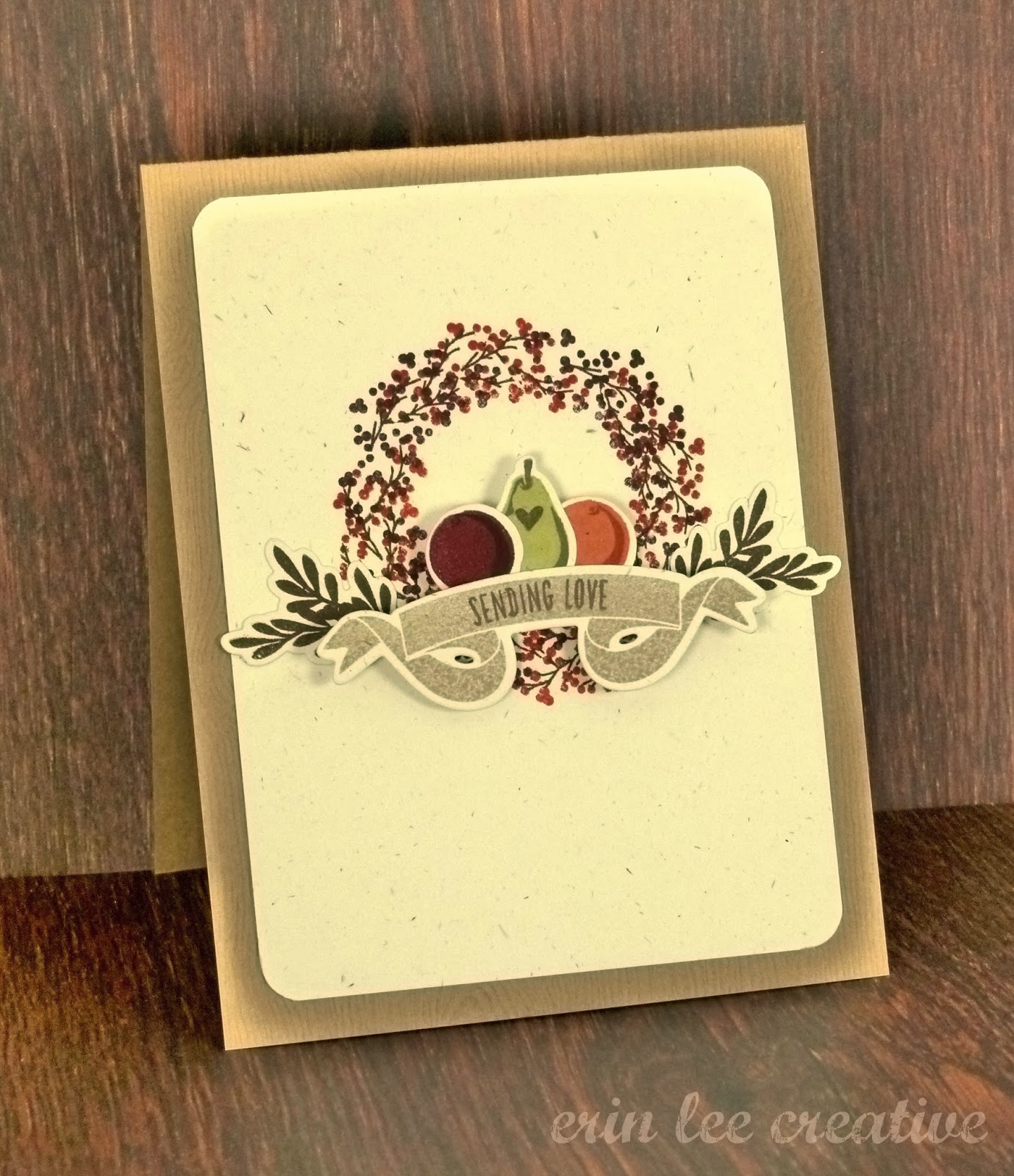 For this card, I used WPlus9's Woodland Wreaths stamp set. Really one of my favorites right now and turned it more fall than Christmas-y. I paired it with Heartfelt Holiday (banner and sentiment). I just adore these little fruits!