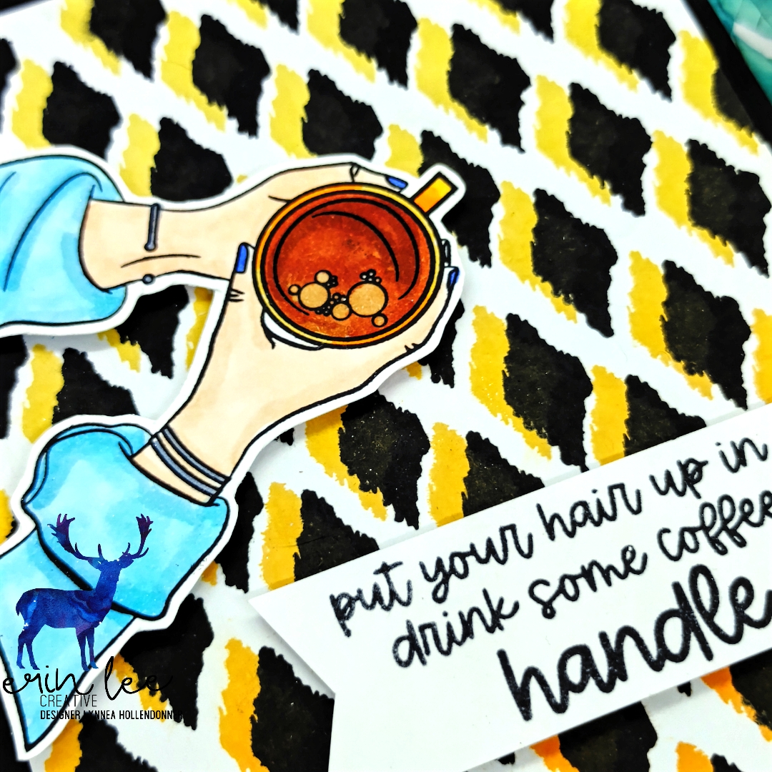 I stamped my image from the Coffee Lover Kit and colored it with Copic Markers. I trimmed it out with scissors and popped it onto my card with foam tape. I stamped a sentiment from the same Coffee Lover Stamp Set and added it to the right side of the card to balance the design.