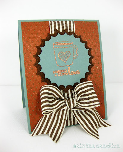 For this card, I used her company's (Market Street Stamps) Daily Grind set. Papertrey Ink Hawaiian Shores paper, Tim Holtz kraft core copper paper, swiss dots embossing folder, copper embossing powder, Stampin Up ribbon and Spellbinders Nestabilities.