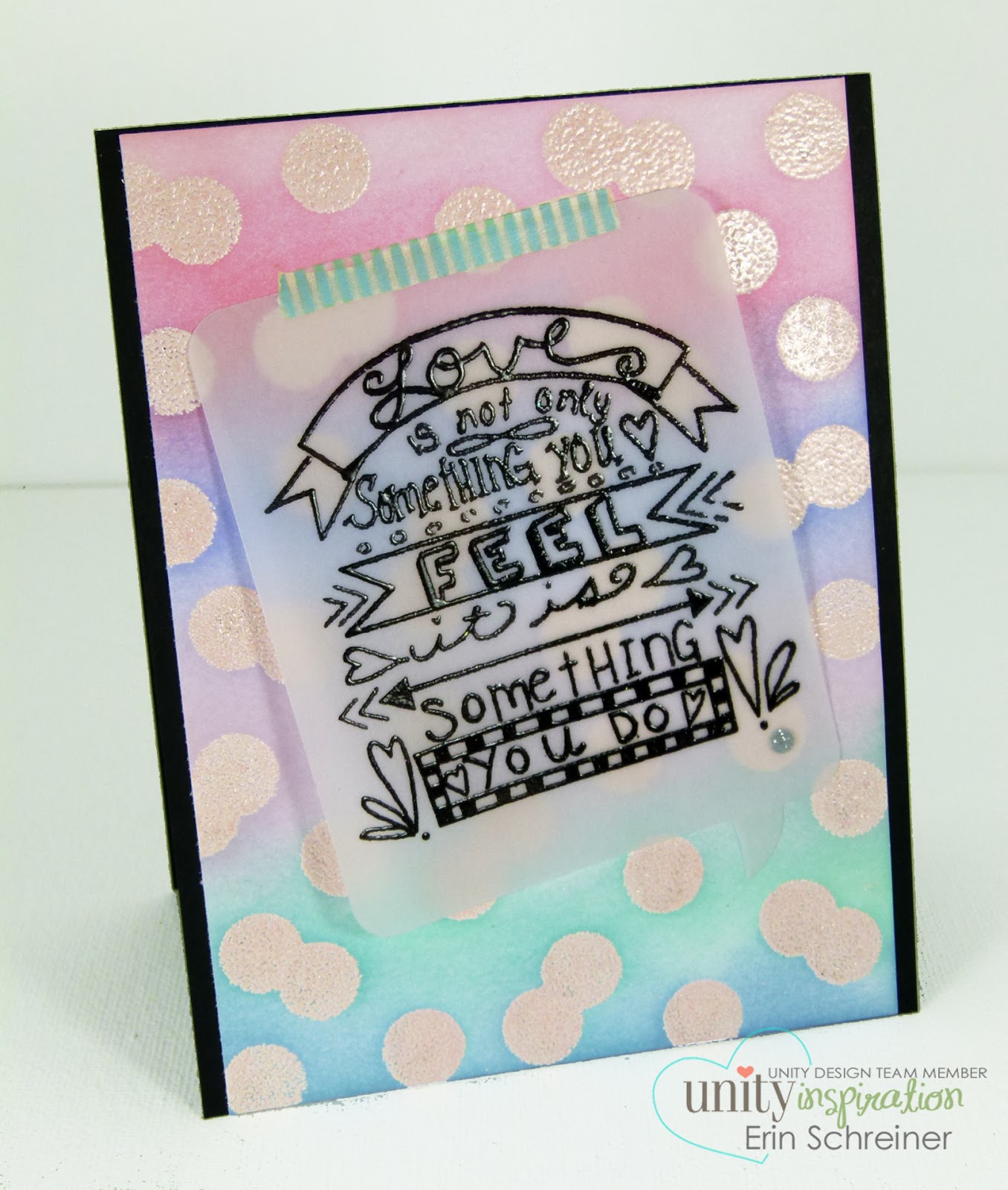 I heat embossed with Versamark and pink Zing embossing powder, then blended Tim Holtz Distress inks for a bokeh look. I then heat embossed the Unity sentiment in black on a vellum speech bubble die cut and adhered it to the card base with a skinny washi tape.