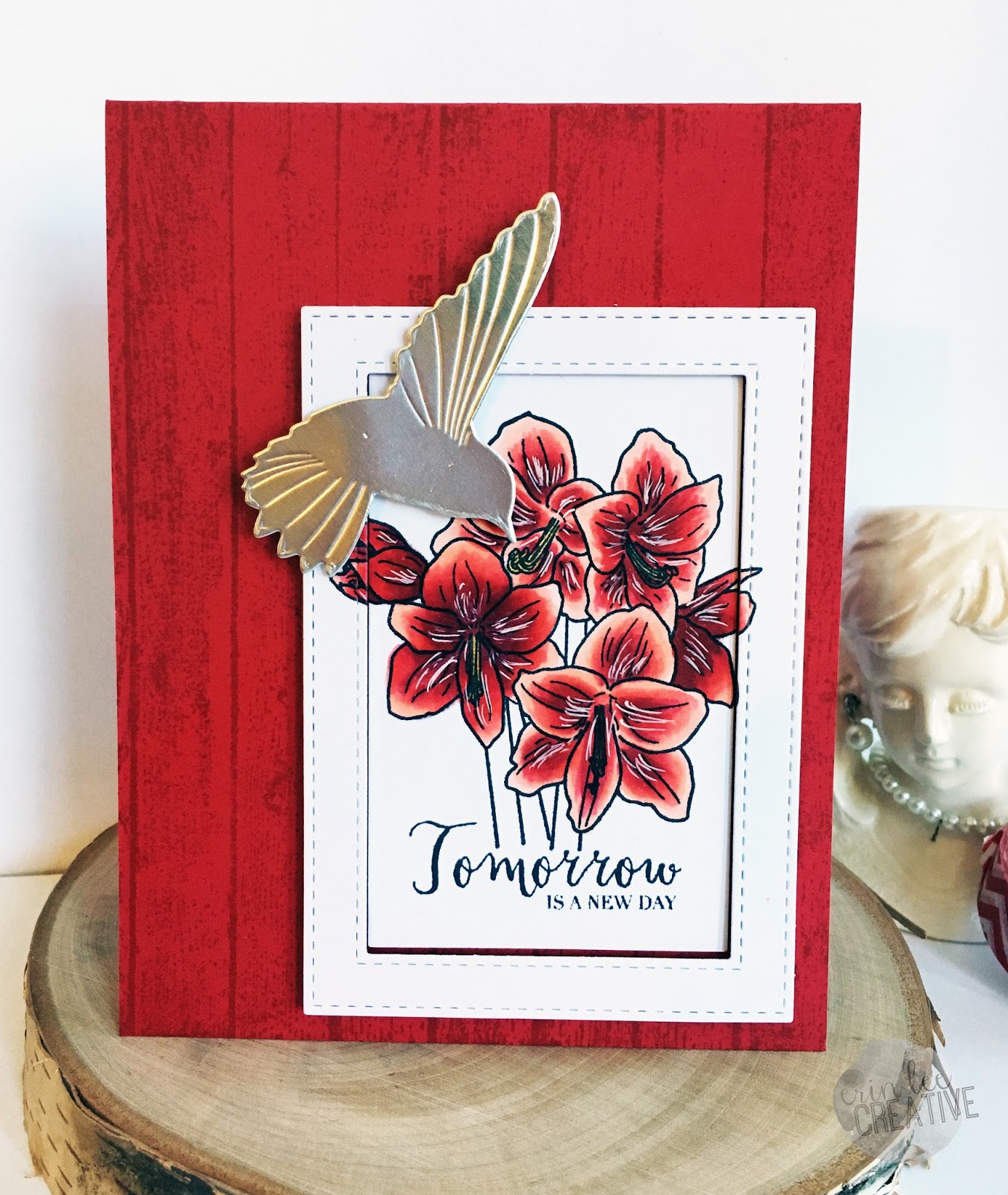 I have been dying to use these WPlus9 Amaryllis for quite some time now. They have been patiently sitting in my "to be used pile" since they were released and I finally got the chance to color these gorgeous flowers yesterday for this week's Simon Says Stamp Wednesday Challenge: Something New. The product highlight is Wplus9 so it was perfect! The sentiment is also WPlus9. The silver hummingbird is a Memory Box die. The frame die is My Favorite Things.