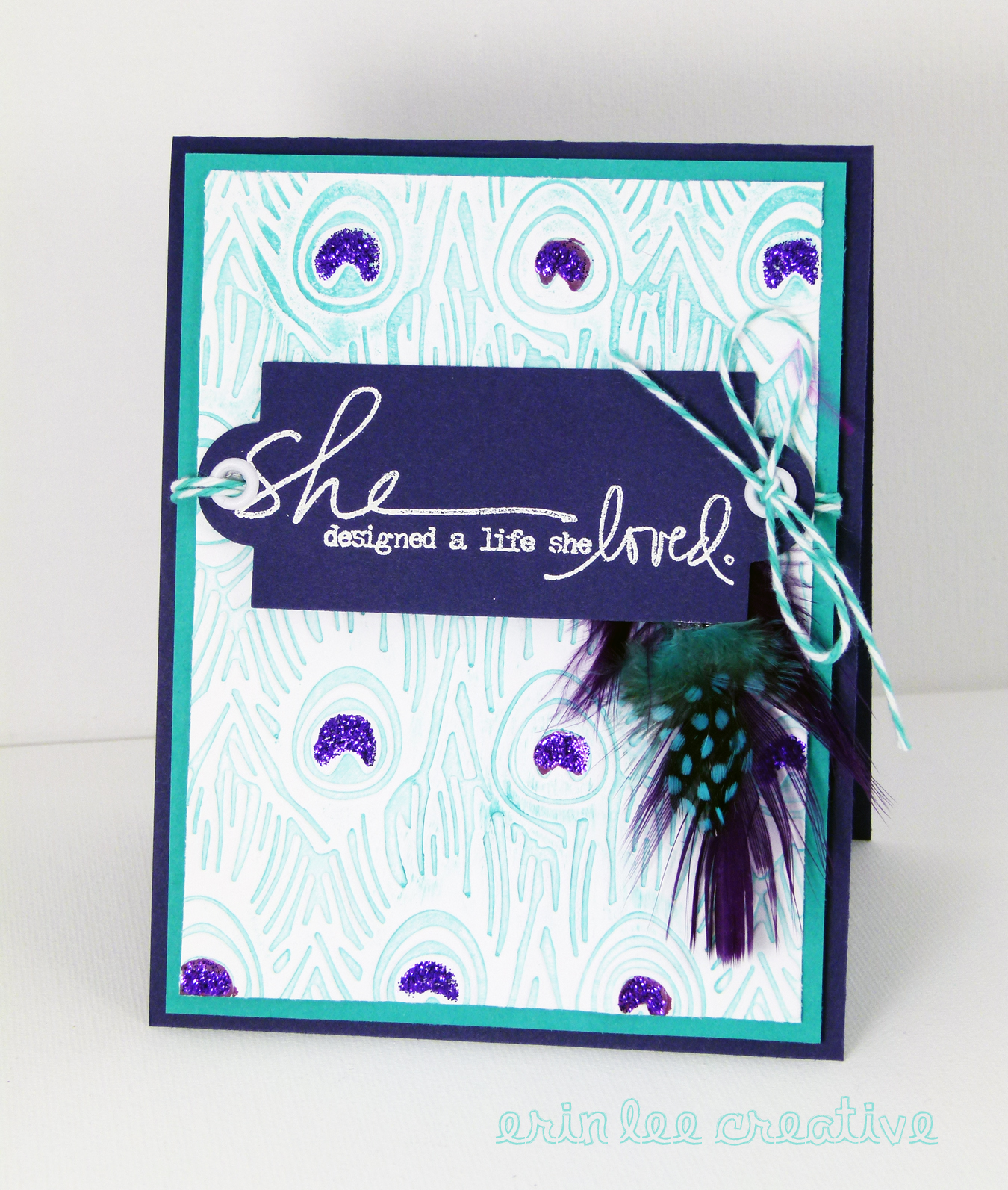 Today, I am sharing a card I made using a fun new peacock embossing folder I picked up. I love the peacock trend right now. I inked directly on the embossing folder and ran it through my Big Shot. I then applied purple Stickles to the paper. The sentiment is from Unity She Said stamp set, and I heat embossed that in white. Added some twine and feathers to finish the card.