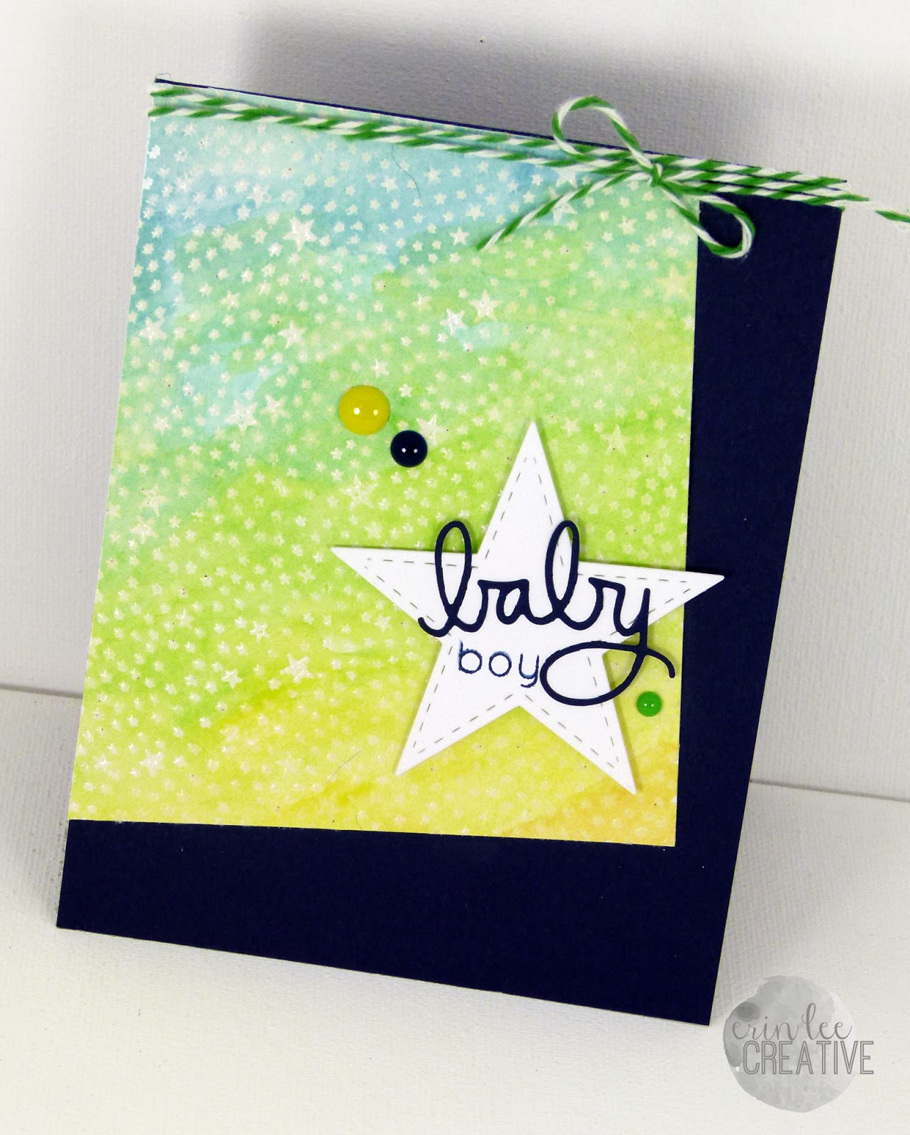 I used the emboss resist technique and then watercolored over it to create my background. The background stamp is from Hero Arts (LOVE stars, have I mentioned that before?) and the baby die and stamp is from Simon Says Stamp. The stitched star is of course, Lil' Inker Designs.