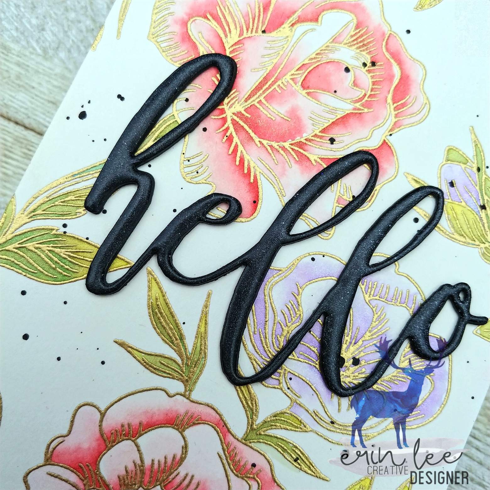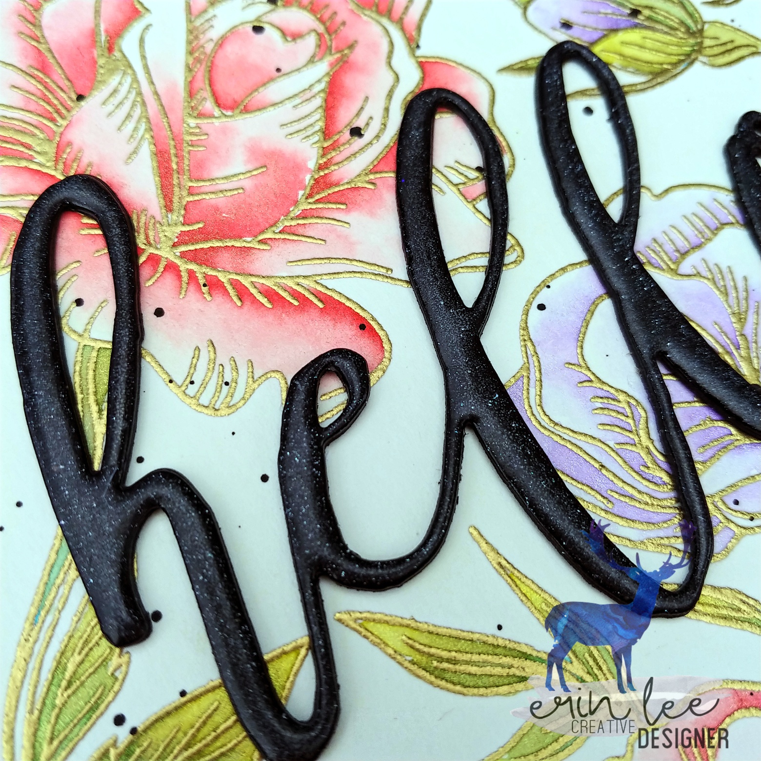 Once my whole background was colored I added a few flicks of black watercolor for texture. I die cut the "hello" sentiment from the Big Hello Love die set four times from black cardstock. I wanted the die cut to really stand out from the background, so I covered one of the die cuts with a clear glitter pen. Then I pressed my Versamark ink pad on top of the glittered die cut and sprinkled on clear embossing powder and heat set. I repeated the process and added a total of three layers of clear powder. Then I stacked up all four of my die cut words with the glittered and heat embossed die cut on top.