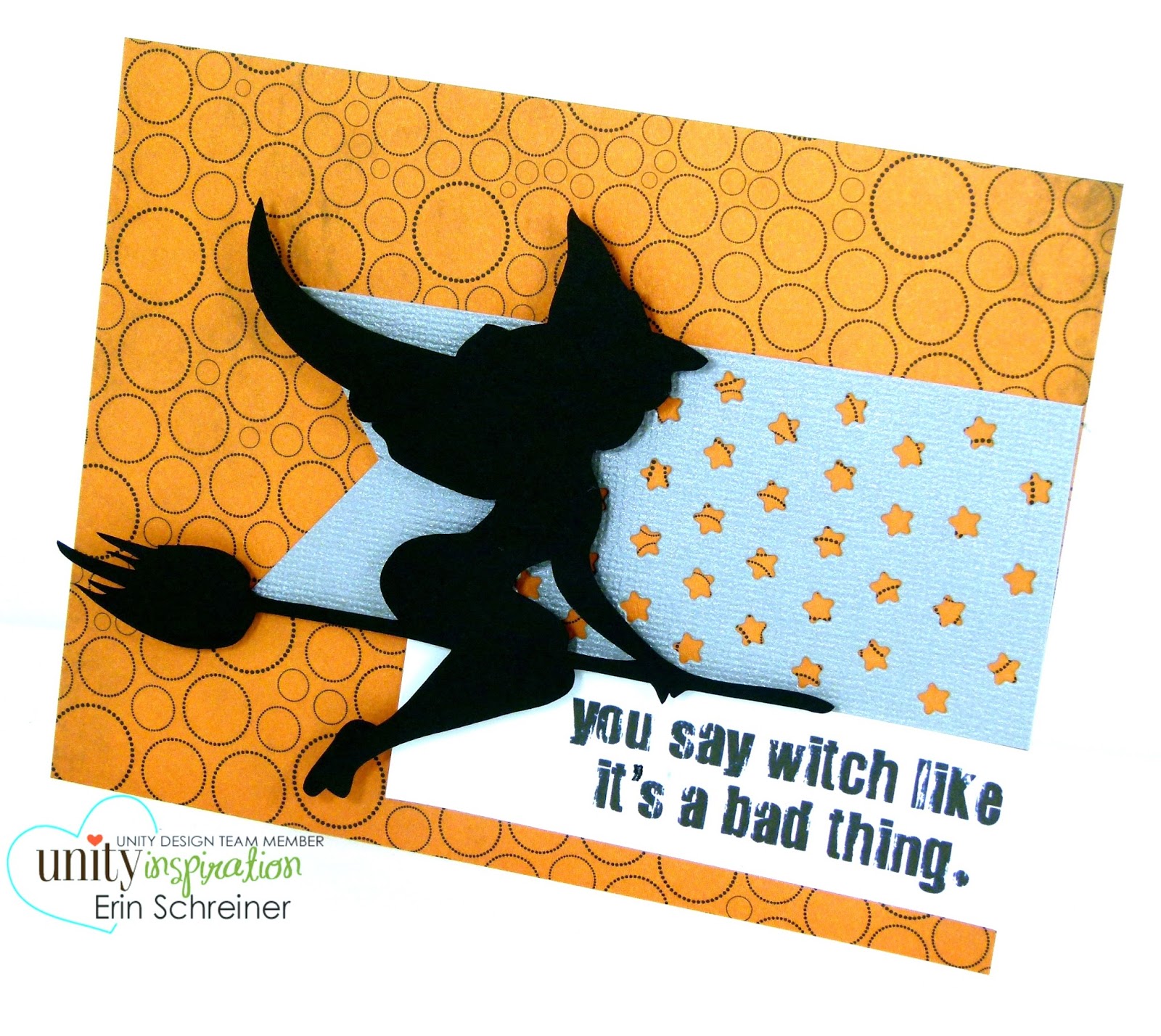 Posting a Halloween card today, one of my new Unity sentiment releases. It comes with a cute witch hat created by Angie Blom, too! I used my Cameo to cut out the witch, love this cut. The star strip is a My Favorite Things die. Halloween will be here before you know it! Mwahahhaha...