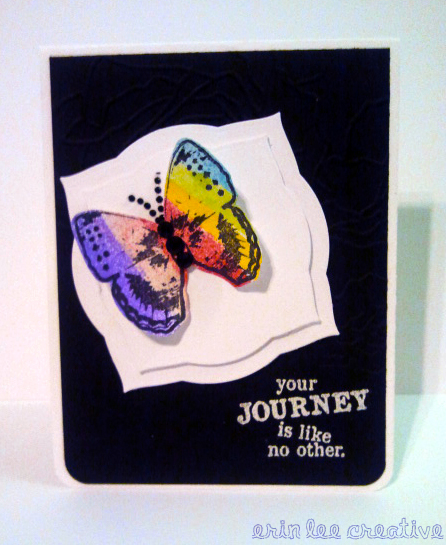 Stamp of the Week - UNITY STYLE! Lovin this butterfly. I used various glimmer mist colors masked with paper. You can't tell in the picture, but I used a Stampin Up embossing folder on the black. Spellbinders, corner rounder, embossing powder, rhinestones....voila!