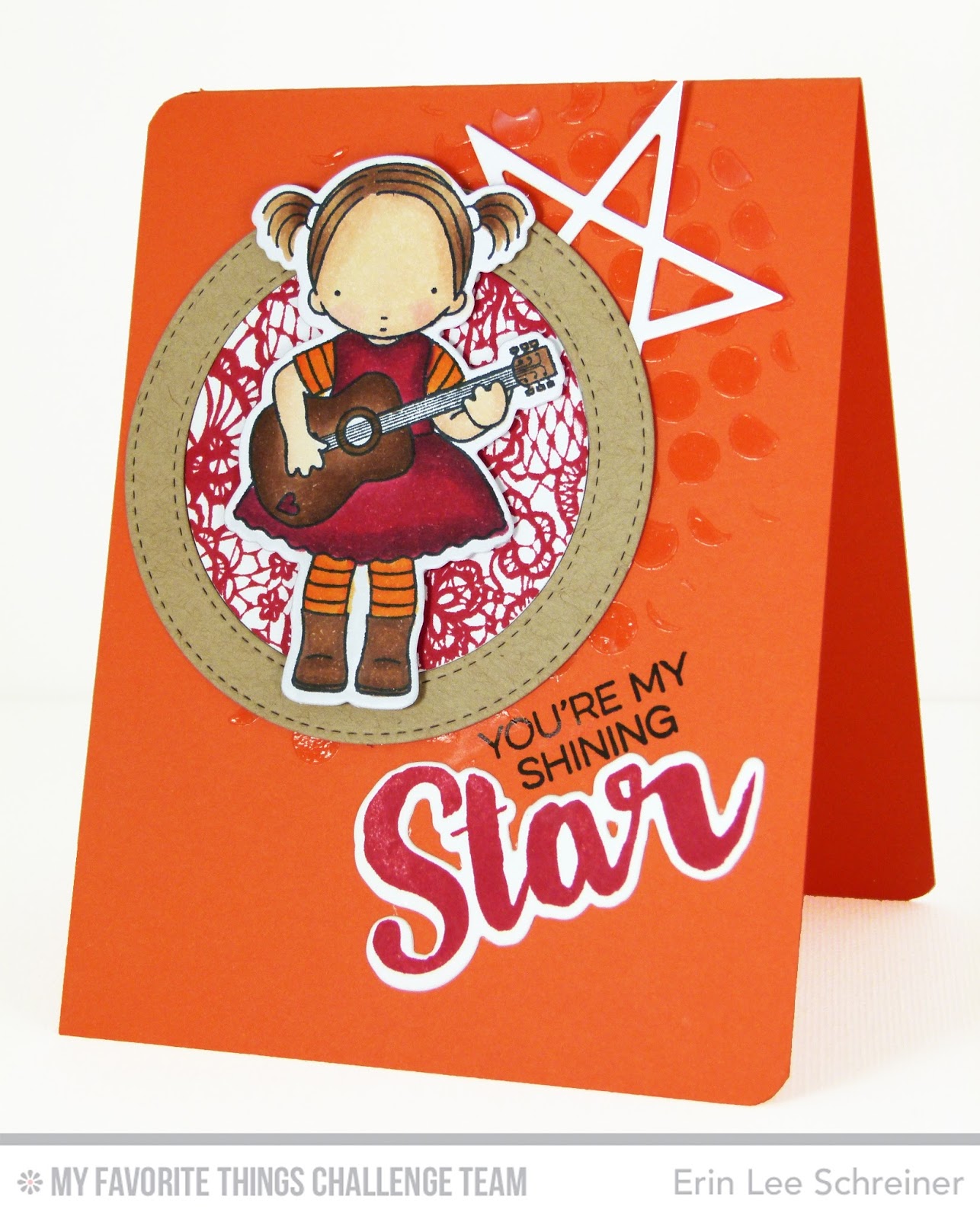 Hi guys! I made a card featuring My Favorite Things products just for fun. I hadn't gotten to color in this sweetie yet and wanted to play with some of the fun new star products because they are just that awesome! Die-namics Stitched Circle Frames Die-namics LLD Lucky Stars Die-namics LLD Count the Stars LLD Count the Stars Pure Innocence Heartstrings Die-namics PI Heartstrings BG Lace Background Stencil Circle Grid Black Licorice Pigment Ink Pad Electric Red Premium Dye Ink Orange Zest Prestige Card Stock Kraft Card Stock Smooth White Card Stock InLinkz.com